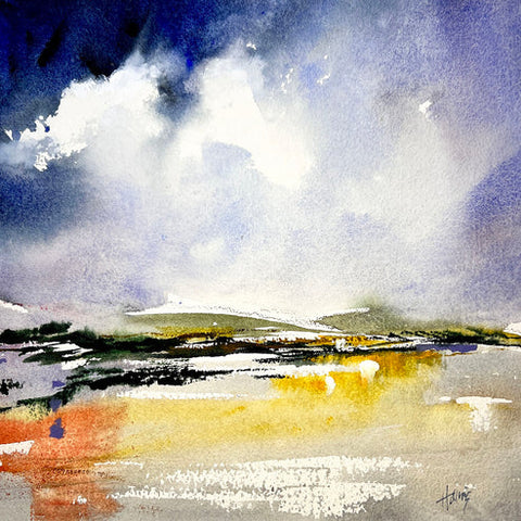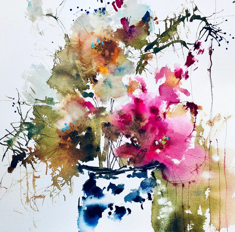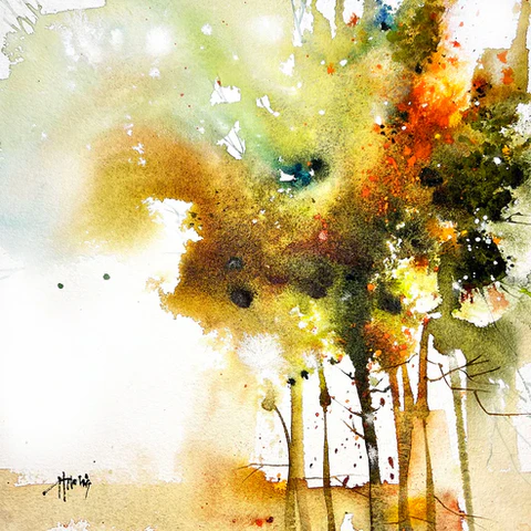 Harnois’s watercolor explore a delicate balance between lightness and looseness, resulting in a distinctive style where each piece carries its own energy. She allows the paint to flow freely, blending colors into captivating contrasts that draw the viewer in. The dynamic interplay of light and dark, along with thoughtful variations in size and scale, often create immersive experiences within her work.